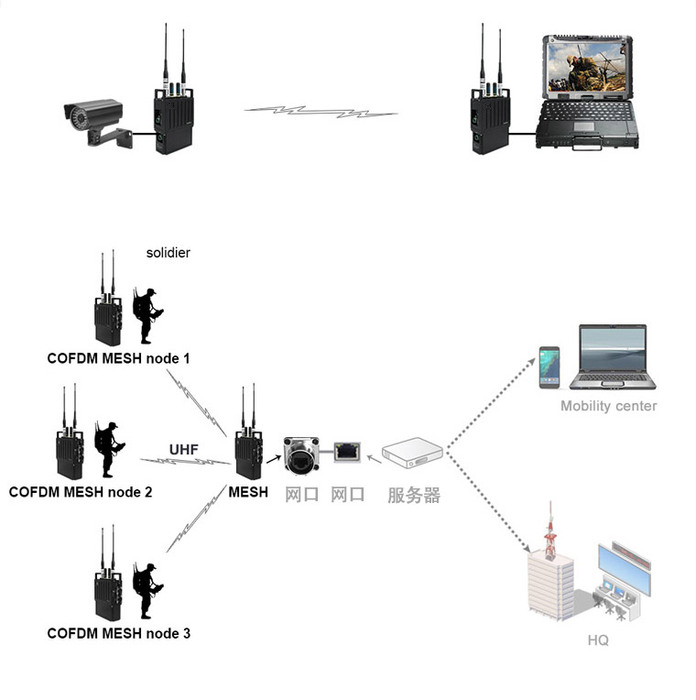 任一節點電臺可同時作為信息采集節點、中繼節點或信息輸出節點,開機即用,實現高清視頻、語音、圖像等數據傳輸,靈活機動、部署簡單。