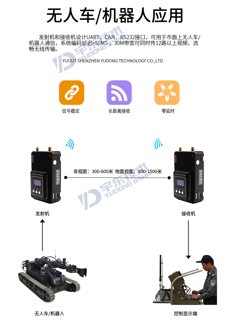 YDTD8000宇東視頻數(shù)據(jù)無線圖傳系統(tǒng)采用工業(yè)級無線高速率數(shù)據(jù)傳輸技術(shù),非視距,非WIFI,集合正交頻分復用時分多址調(diào)制及MIMO多進多出容量技術(shù),完全基于IP互聯(lián)網(wǎng)協(xié)議,實現(xiàn)全雙向透明通道傳輸。非視距:300-600米;地面視距:800-1500米;空對地:5000米。系統(tǒng)為純硬件連接,即插即用;創(chuàng)新性液晶一體化設計、豐富的CAN總線、RS-232、TTL電平接口,更好的用戶角度體驗。通道最大支持30Mbps吞吐量,可廣泛應用于工業(yè)自動化、工業(yè)機器人、無人機、視頻監(jiān)控等通信工作。