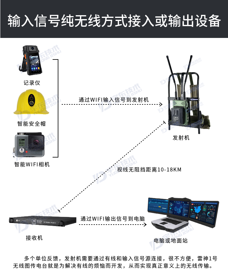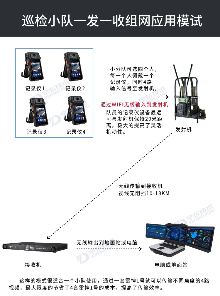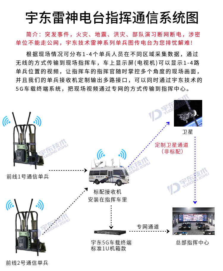 宇東技術雷神1號背負式高清無線圖傳電臺,是公司針對應急救援指揮、公安、反恐作戰、消防救援、邊防執勤、海警海關巡檢、部隊拉練演習、森林消防等,在突發重大事件,斷網斷電,通信中斷的情況下,現場工作人員通過宇東雷神系列單兵圖傳電臺,把現場采集的數據實時無線傳輸到指揮車/臨時指揮部大屏幕,讓指揮部領導對現場情況一目了然,節省了到達現場的時間,可快速做緊急指揮調度,最大限度的減少突發事件帶來的各種損失。